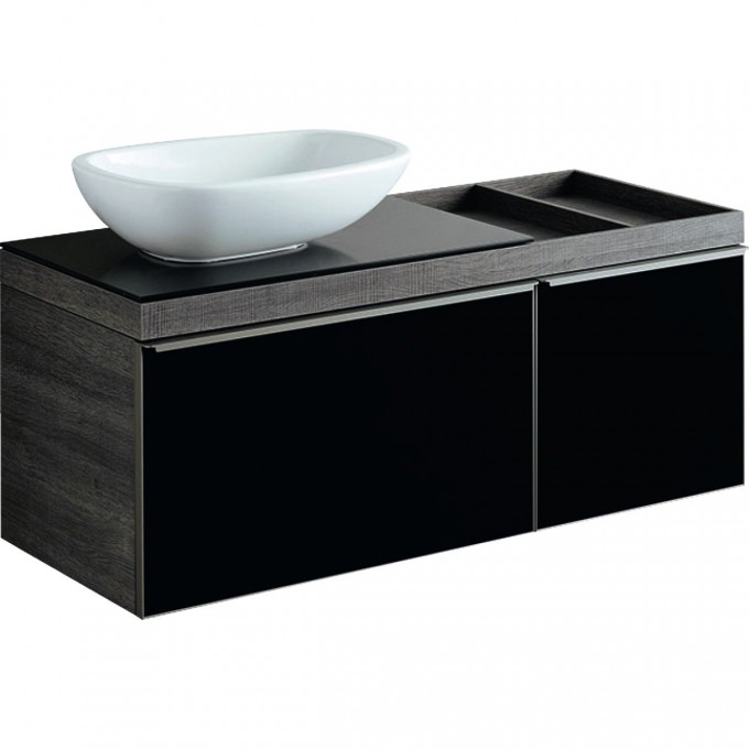 Тумба под раковину Geberit Citterio 118 L 500.564.JJ.1 черный/темный дуб демонстрирует приятный дизайн в стиле модерн. Выбирая подходящую модель, в первую очередь надо учесть ширину тумбы, которая равна 1184 мм. Установка этой тумбы предусмотрена подвесная. Аккуратная геометрия прямых линий в элегантном силуэте тумбы из коллекции Citterio сделали ее желаемой среди людей с самыми разными вкусами. Этот важный элемент мебели для ванной адаптирован к эксплуатации в условиях повышенной влажности. Влагостойкий ЛДСП - материал, из которого выполнен корпус изделия, фасад – из Стекла. Обратите внимание, что двери выдвижные. Система хранения удобная: с ящиками